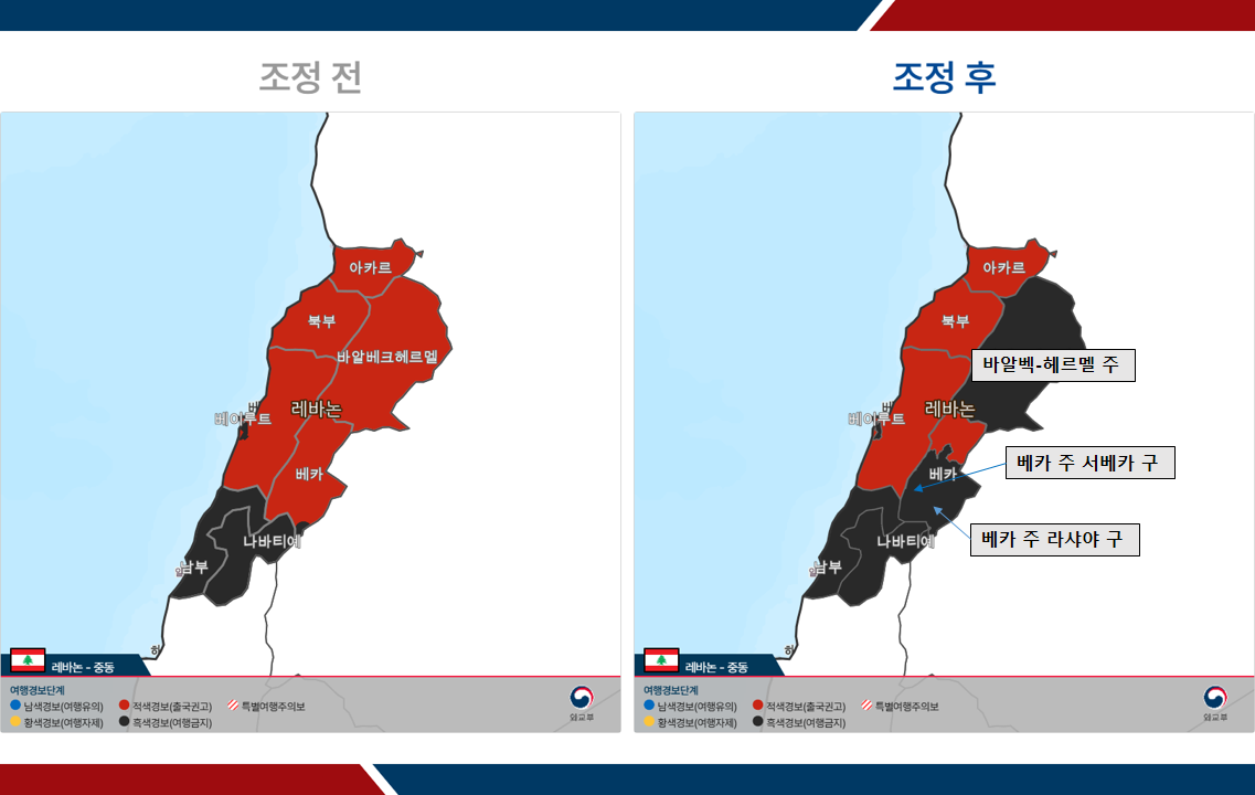 레바논의 경우 바알벡-헤르멜 주, 베카 주 서베카 구 및 라샤야 구 지역이 한국시간 3.20.(금) 20시부로 여행경보 4단계(여행금지) 지역으로 추가 지정됩니다.